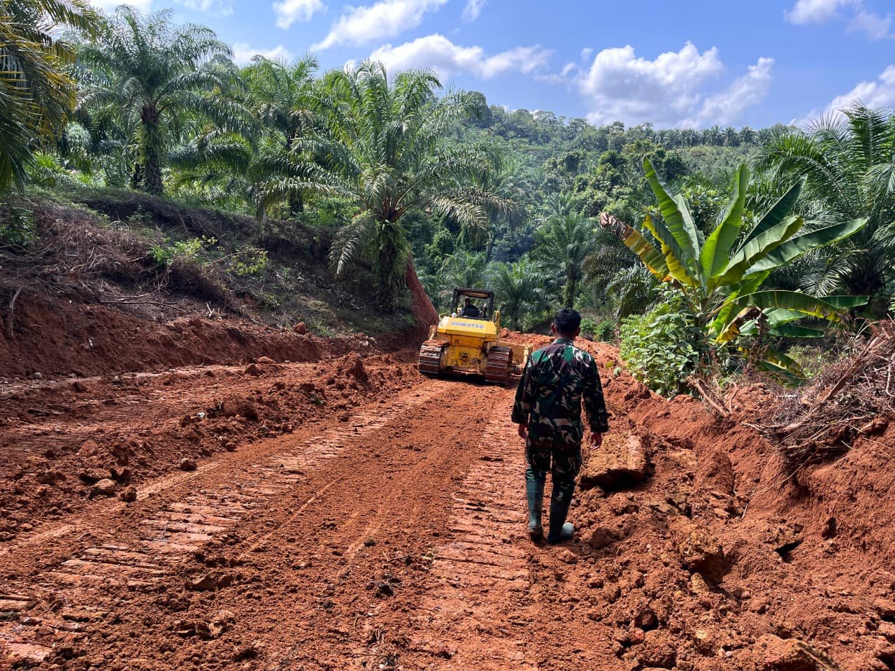 Anggota Satgas TMMD tampak aktif bekerja di lokasi, menggunakan alat berat untuk memperlancar pekerjaan. Medan yang berat justru semakin menambah semangat kerja sama antara personel dengan masyarakat setempat yang bergotong royong membantu proses ini.