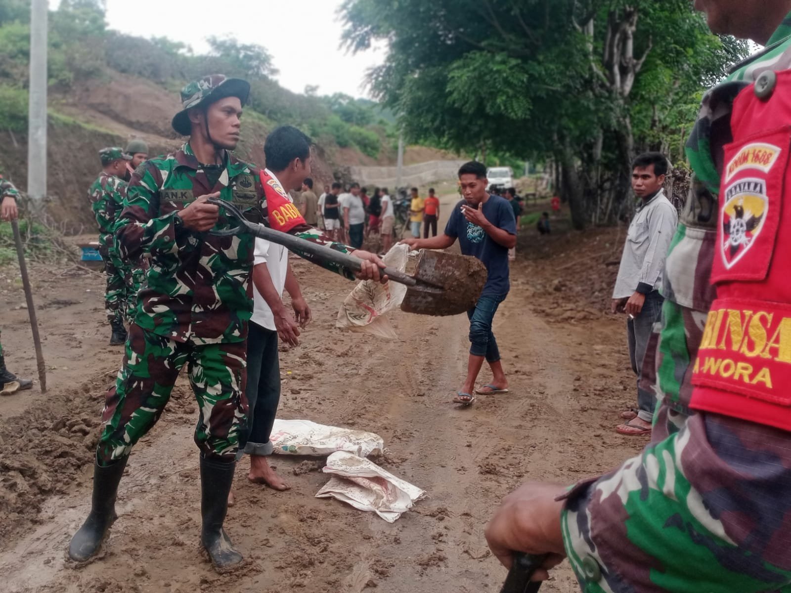 Posramil Wera Bersama Warga Bersihkan Jalan dari Endapan Lumpur