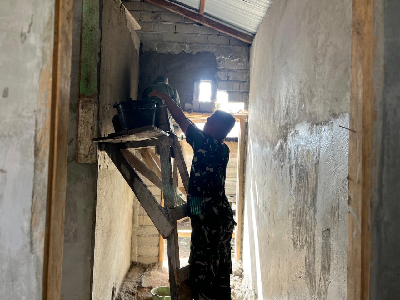 Personel Tentara Nasional Indonesia yang tergabung dalam Satuan Tugas TMMD, bekerja sama dengan penduduk setempat, terlihat saling bahu-membahu dalam proses pembangunan rumah. Fokus pekerjaan meliputi pemasangan dinding, penyempurnaan rangka bangunan, serta penataan interior rumah agar segera dapat dihuni oleh penerima manfaat.