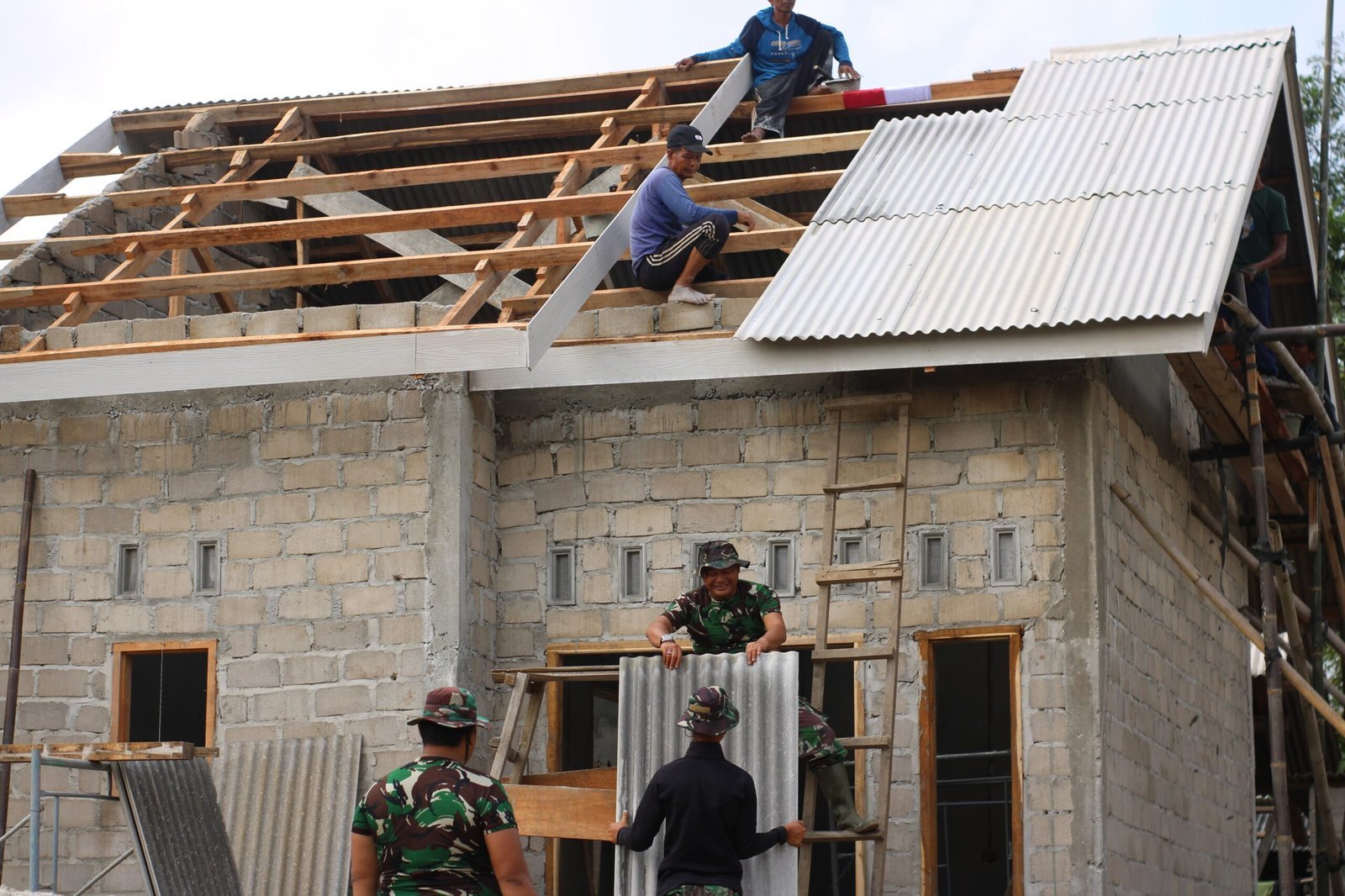Tahapan ini menandai bahwa struktur utama rumah sudah terbentuk kokoh dan pengerjaan mulai berfokus pada penyelesaian bagian atas dan penyempurnaan interior. Para personel Satgas TMMD bersama warga bahu-membahu menyelesaikan setiap bagian dengan rapi dan teliti.