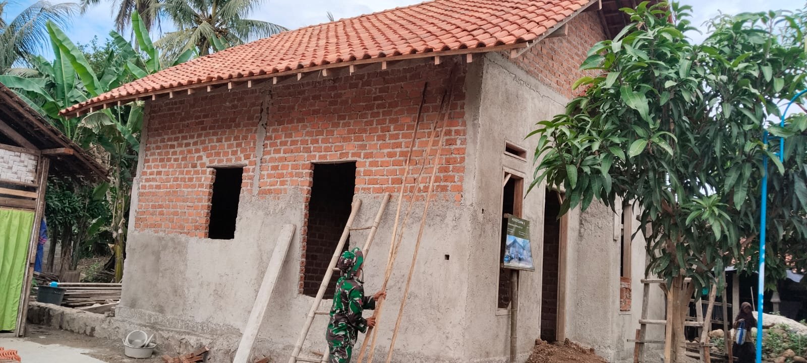 Kabupaten Pesawaran – Ibu Siti Hamdiah, salah satu penerima manfaat program Rumah Tidak Layak Huni (RTLH) di Desa Tanjung Rejo, kini tengah berada pada tahap plesteran dinding depan rumahnya yang sedang direnovasi. Upaya ini merupakan bagian dari kegiatan TNI Manunggal Membangun Desa (TMMD) Ke-127 yang diinisiasi oleh Kodim 0421/LS.