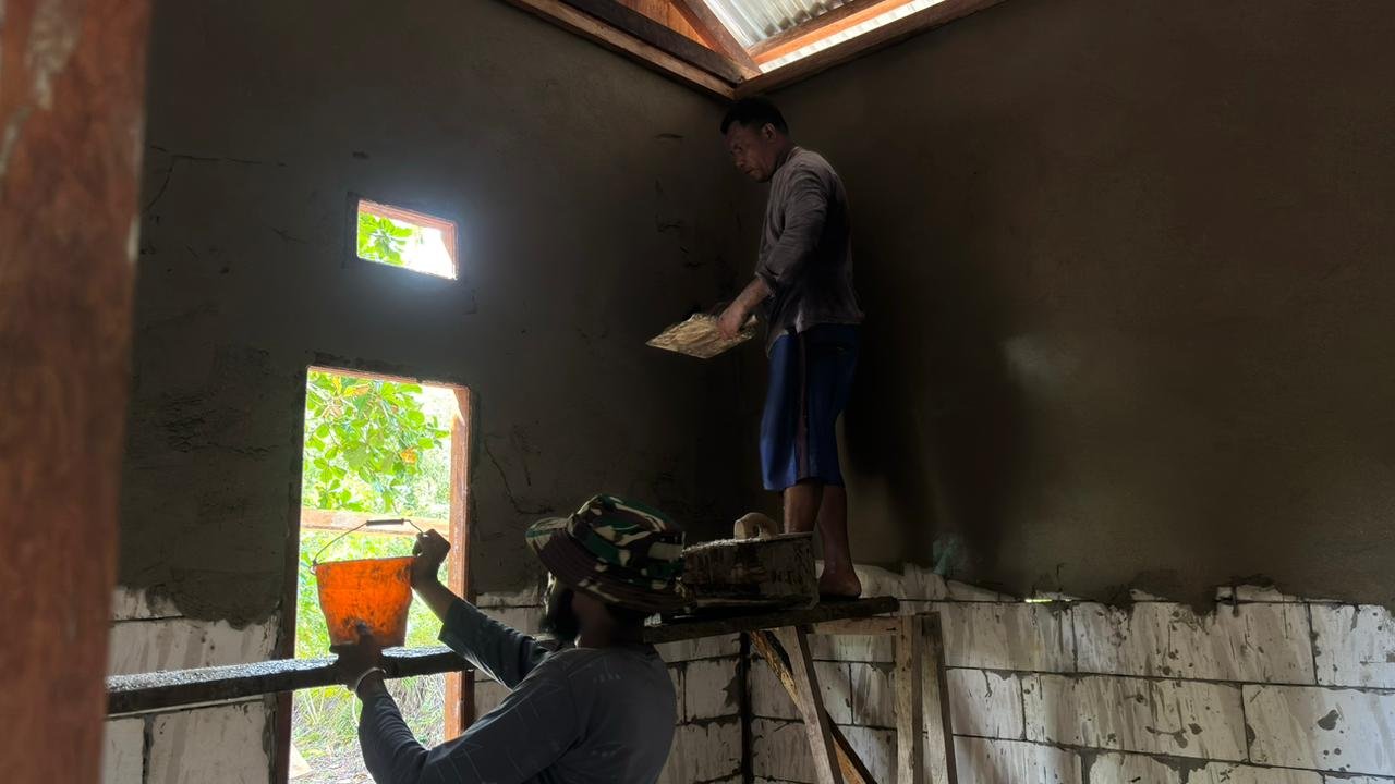 Kegiatan ini merupakan bagian dari tahapan pembangunan yang bertujuan untuk memperkuat struktur bangunan agar lebih layak untuk dihuni. Personel Satgas bekerja sama dengan masyarakat setempat dalam proses pemasangan plester, mengedepankan ketelitian dan kehati-hatian.