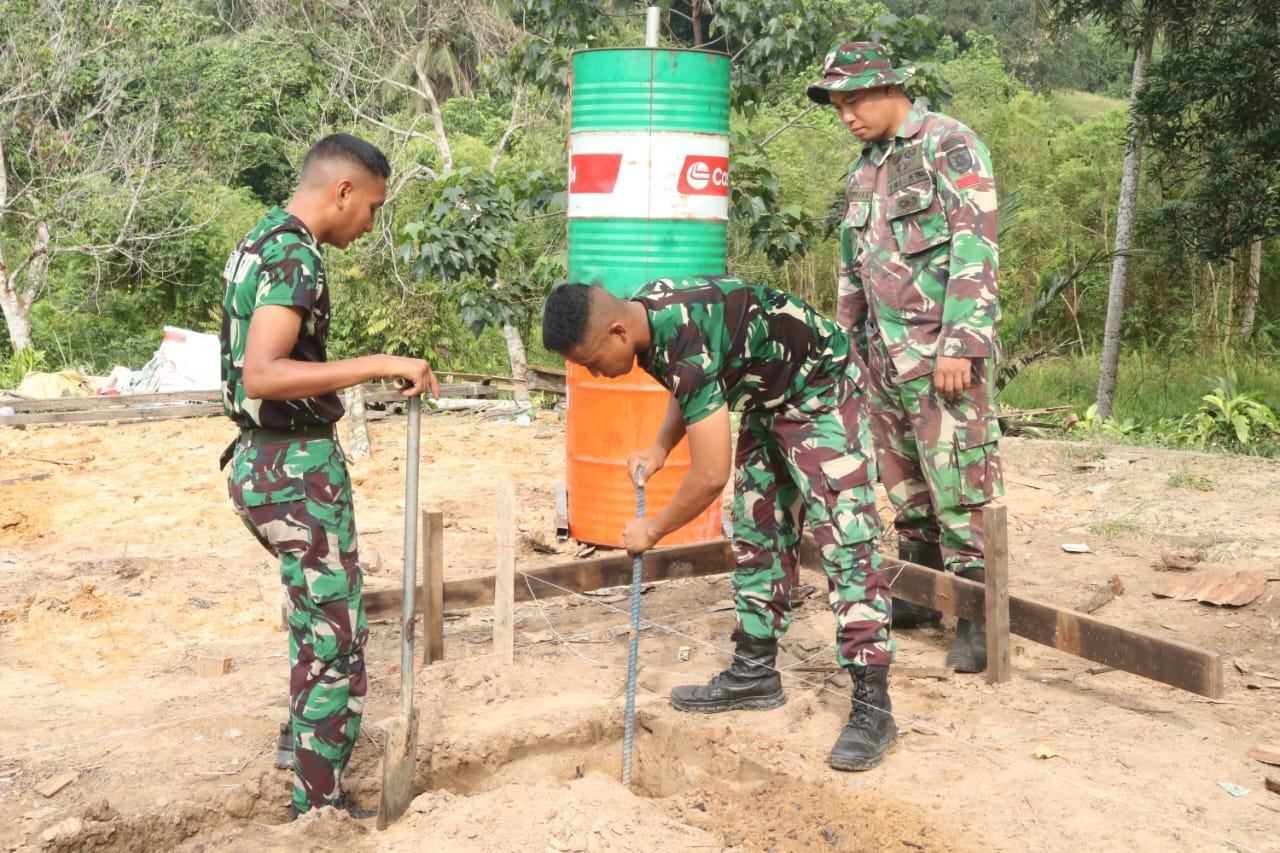 Sejak pagi, Senin (28/07), sejumlah anggota Satgas TMMD bersama warga setempat terlihat sibuk menggali tanah untuk membangun pondasi rumah. Dengan semangat gotong royong, pekerjaan demi pekerjaan dilakukan secara bergantian. Ada yang menggali, ada yang mengangkut batu, hingga mengukur letak tiang yang akan dipasang. Semua berjalan kompak demi memberikan hunian yang lebih layak bagi Rahman dan keluarganya.