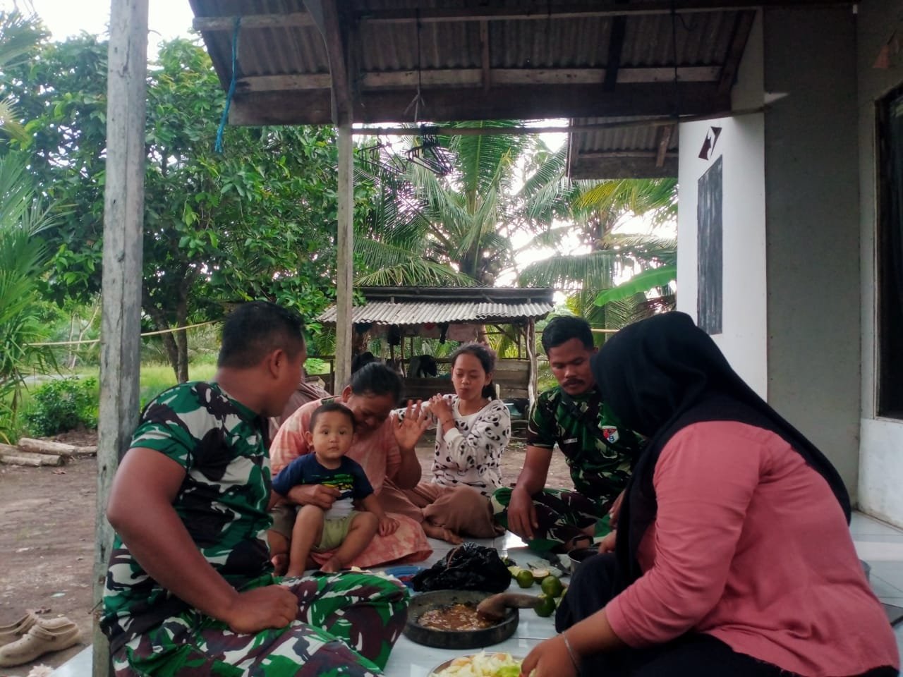 BARITO KUALA – Suasana keakraban begitu terasa di Desa Tumih, Kecamatan Wanaraya, saat anggota Satgas TMMD Ke-126 Kodim 1005/Barito Kuala menyempatkan diri untuk beranjangsana ke rumah warga. Di sela waktu istirahat, para prajurit tampak duduk santai di teras rumah warga sambil menikmati rujak buatan ibu-ibu desa.