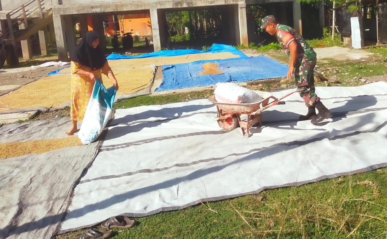 Pendampingan kepada petani tidak hanya sampai selesai di masa panen saja, tetapi masih terus dilakukan sampai penjemuran padi Babinsa juga hadir membantu para petani di desa binaannya.