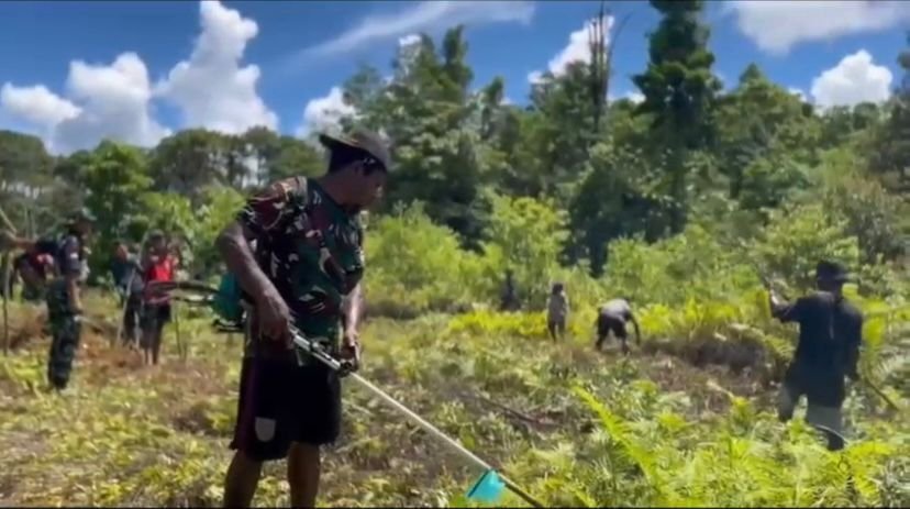 Maybrat, Papua Barat Daya — Bentuk aplikasi kegiatan teritorial dengan masyarakat sekitar, Satgas Pamtas RI-PNG Kewilayahan Yonif 763/SBA Pos Afkrem membantu masyarakat membersihkan jalanan di sekitar Kampung Afkrem. (3 Oktober 2025).