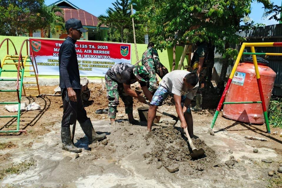Lubuk Pinang, 5 Agustus 2025 — Pelaksanaan TMMD Reguler ke-125 Kodim 0428/Mukomuko terus menyasar pembangunan infrastruktur dasar yang bermanfaat langsung bagi masyarakat. Pada hari ke-14, fokus pekerjaan diarahkan pada pengecoran tiang tedmon untuk sumur bor titik ketiga yang berlokasi di lembaga pendidikan anak usia dini, Raudhatul Athfal (RA), Desa Sumber Makmur SP 8, Kecamatan Lubuk Pinang.