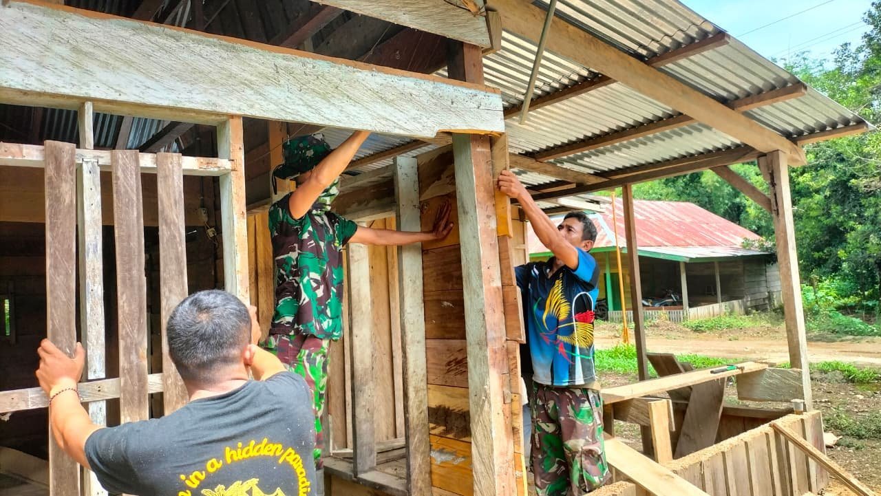 Pekerjaan dilakukan dengan semangat gotong royong, di mana personel TNI dan warga saling bahu membahu memperbaiki bagian atap, dinding, dan lantai rumah agar layak dihuni.