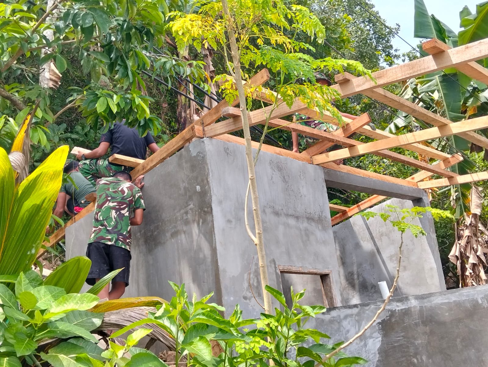 Pemasangan rangka atap dilakukan dengan tingkat ketelitian yang tinggi agar dapat mendukung penutup atap secara stabil, serta memastikan saluran air hujan berjalan dengan lancar. Tindakan ini menunjukkan komitmen TNI untuk menyediakan fasilitas sanitasi yang tidak hanya diselesaikan tepat waktu, namun juga memiliki kualitas yang baik dan ketahanan yang lama.