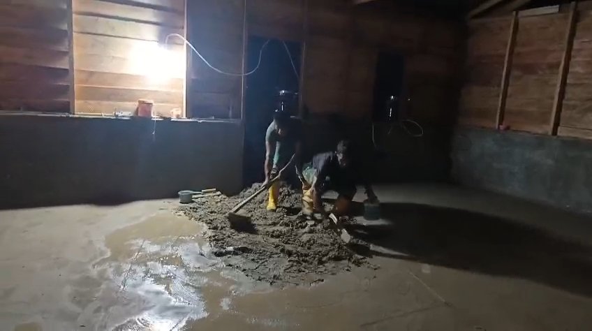 Anggota Satgas TMMD bekerja sama dengan warga setempat dalam proses pengecoran lantai. Mereka menggunakan campuran semen dan pasir untuk menciptakan lantai yang lebih kokoh, bersih, dan higienis.