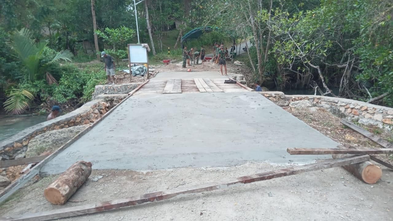 Kaimana – Anggota Satgas TNI Manunggal Membangun Desa (TMMD) ke-127 dari Kodim 1804/Kaimana melanjutkan proyek pembangunan jembatan di Kampung Marsi, Distrik Kaimana, Kabupaten Kaimana pada hari Sabtu, 7 Maret 2026. Dalam kegiatan tersebut, mereka fokus pada pengecoran lantai di ujung jembatan.