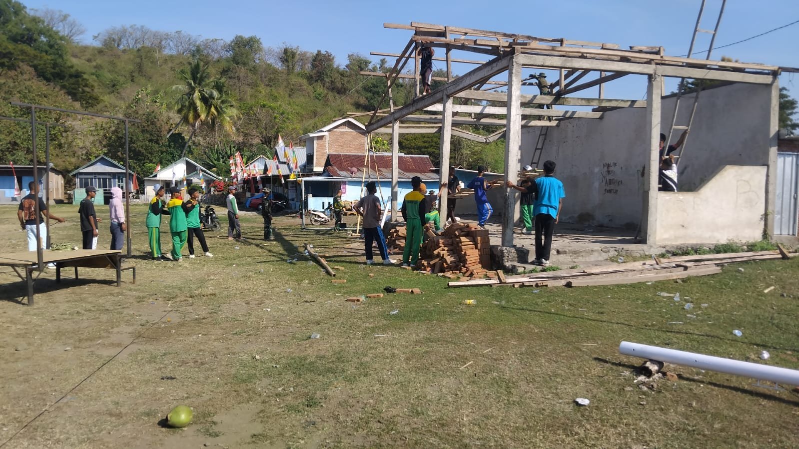 Proses rehabilitasi melibatkan perbaikan struktur kayu, besi, dan atap yang rusak, serta pembersihan area tribun. Warga terlihat antusias, bahu-membahu bersama personel Satgas TMMD.
