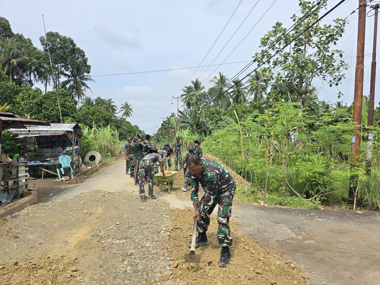 Di lapangan, kebersamaan antara TNI dan masyarakat tampak nyata. Para prajurit dan warga saling bahu-membahu menimbun badan jalan dengan material tanah pilihan. Keringat yang menetes tak menyurutkan semangat mereka untuk terus bekerja, didorong oleh keinginan yang sama agar akses jalan desa segera dapat dimanfaatkan.