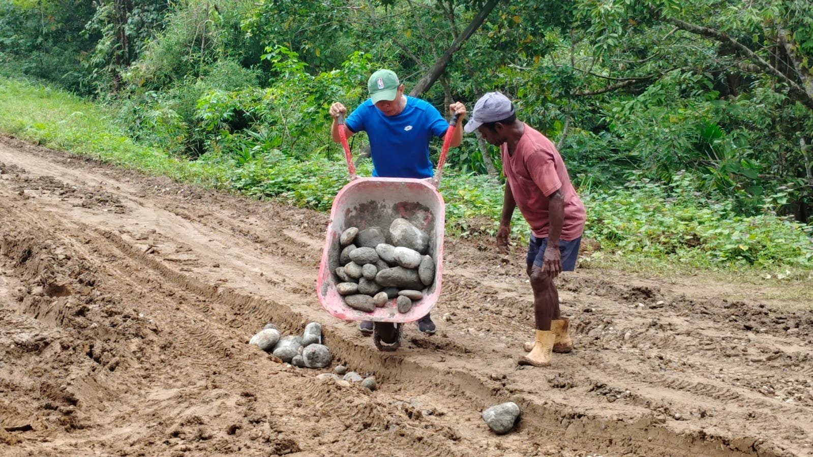 Pada hari Selasa (28/10/2025), personel Satgas bersama warga bahu membahu memperbaiki jalan rusak akibat kondisi cuaca yang kerap berubah. Penimbunan dilakukan agar jalan menjadi lebih rata dan aman dilalui, baik oleh masyarakat maupun kendaraan pengangkut material TMMD.