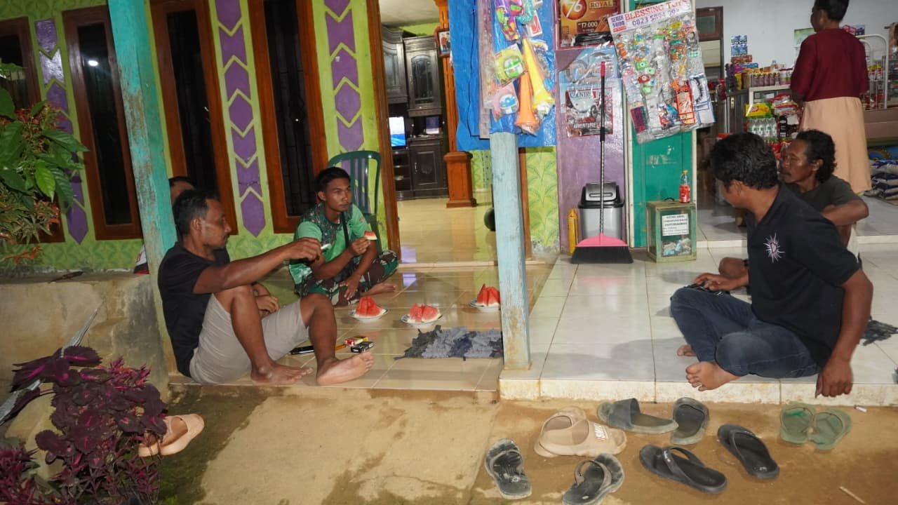 Setelah menjalankan tugas fisik yang menuntut tenaga, para prajurit berkumpul di rumah warga untuk bersantai. Terlihat suasana akrab saat anggota Satgas dan masyarakat saling bercengkerama sambil menikmati malam yang damai.