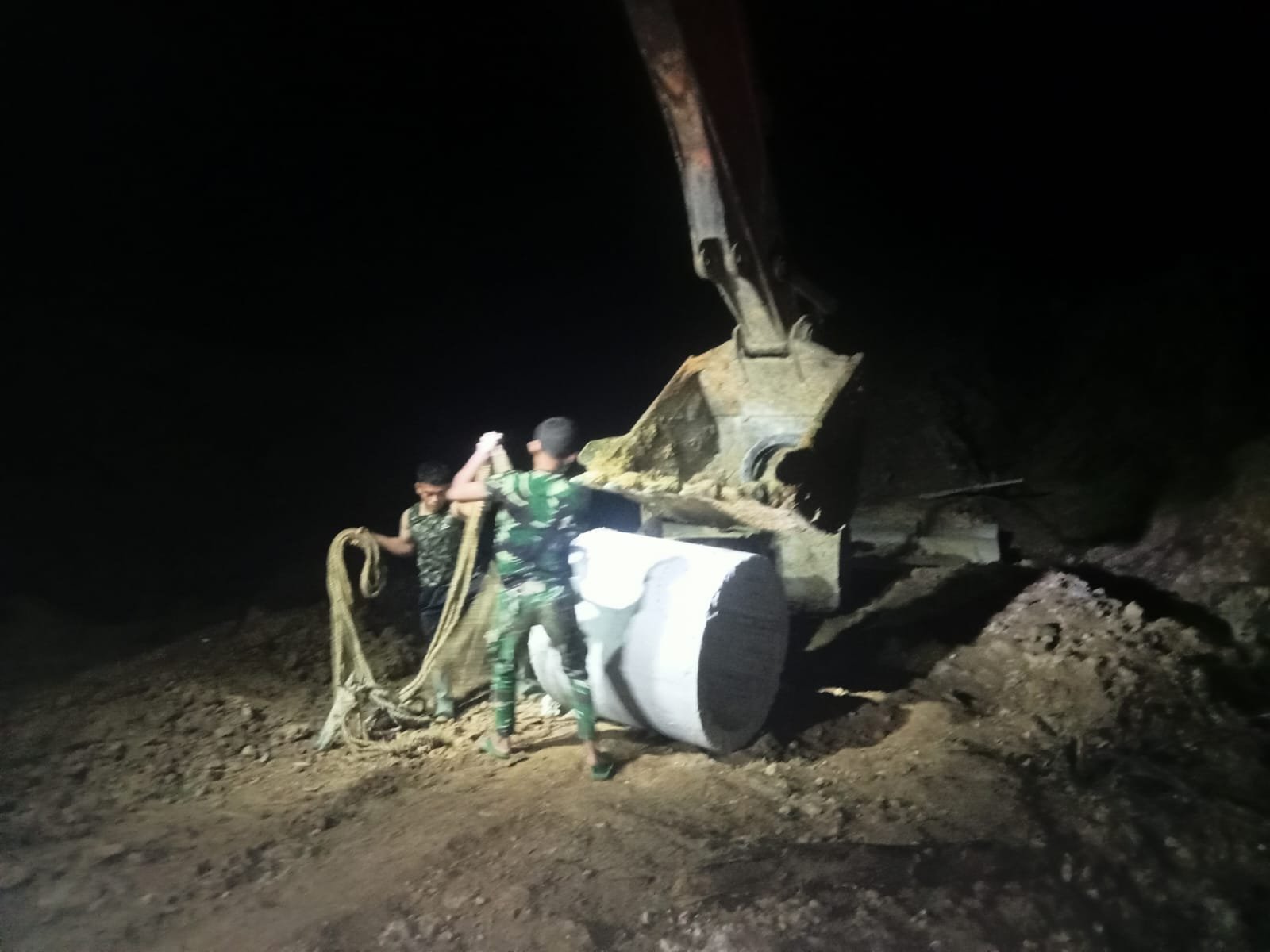 Pada Sabtu malam, 7 Maret 2026, para prajurit terlihat masih berjibaku di lokasi pembangunan jalan yang menghubungkan Desa Ujong Blang dengan Desa Pante Ara, Kecamatan Beutong. Fokus pekerjaan malam itu adalah mendistribusikan gorong-gorong yang akan dipasang sebagai jalur aliran air di badan jalan.
