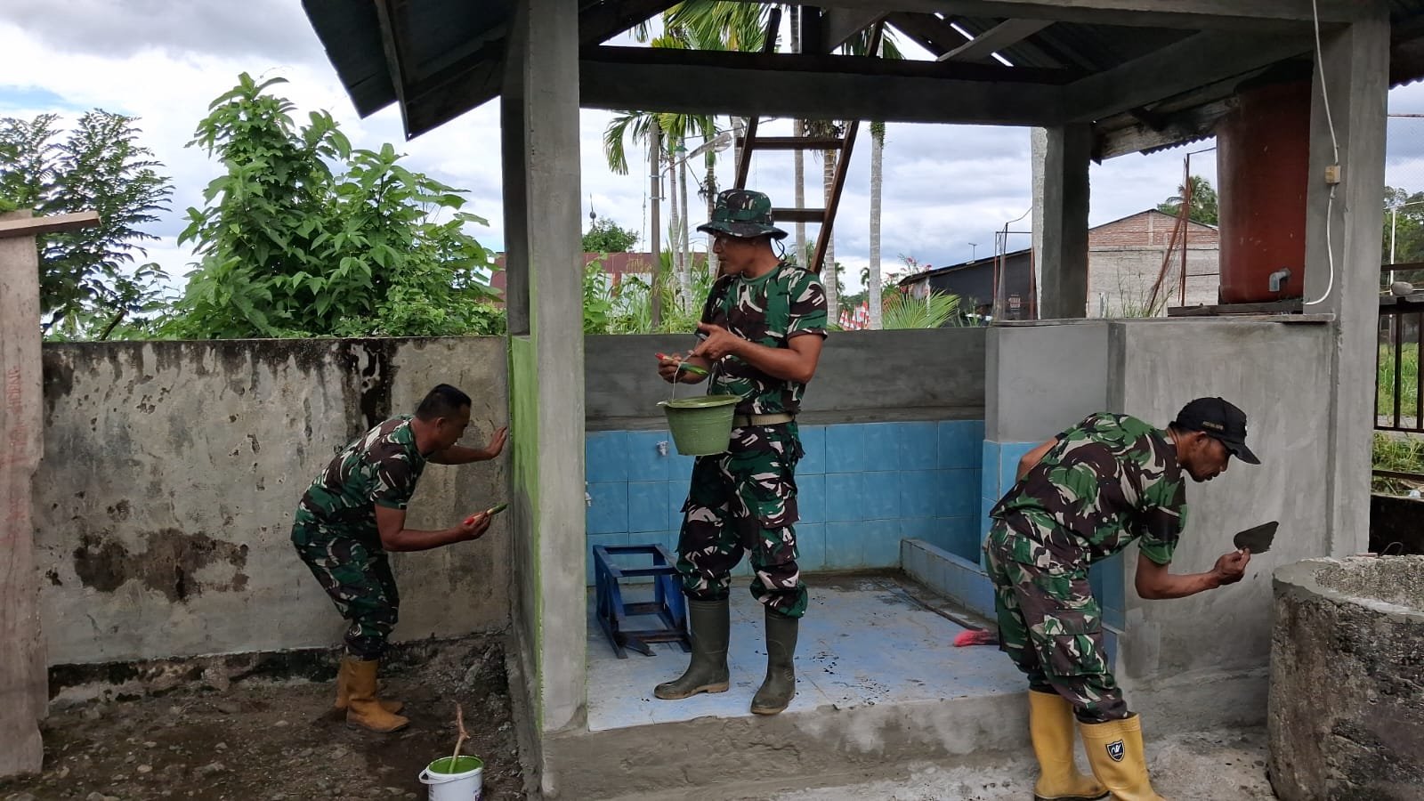 Personel Satgas TMMD melaksanakan pengecatan dan pembersihan penampungan air bersih guna memastikan fasilitas tersebut siap digunakan masyarakat dalam jangka panjang.