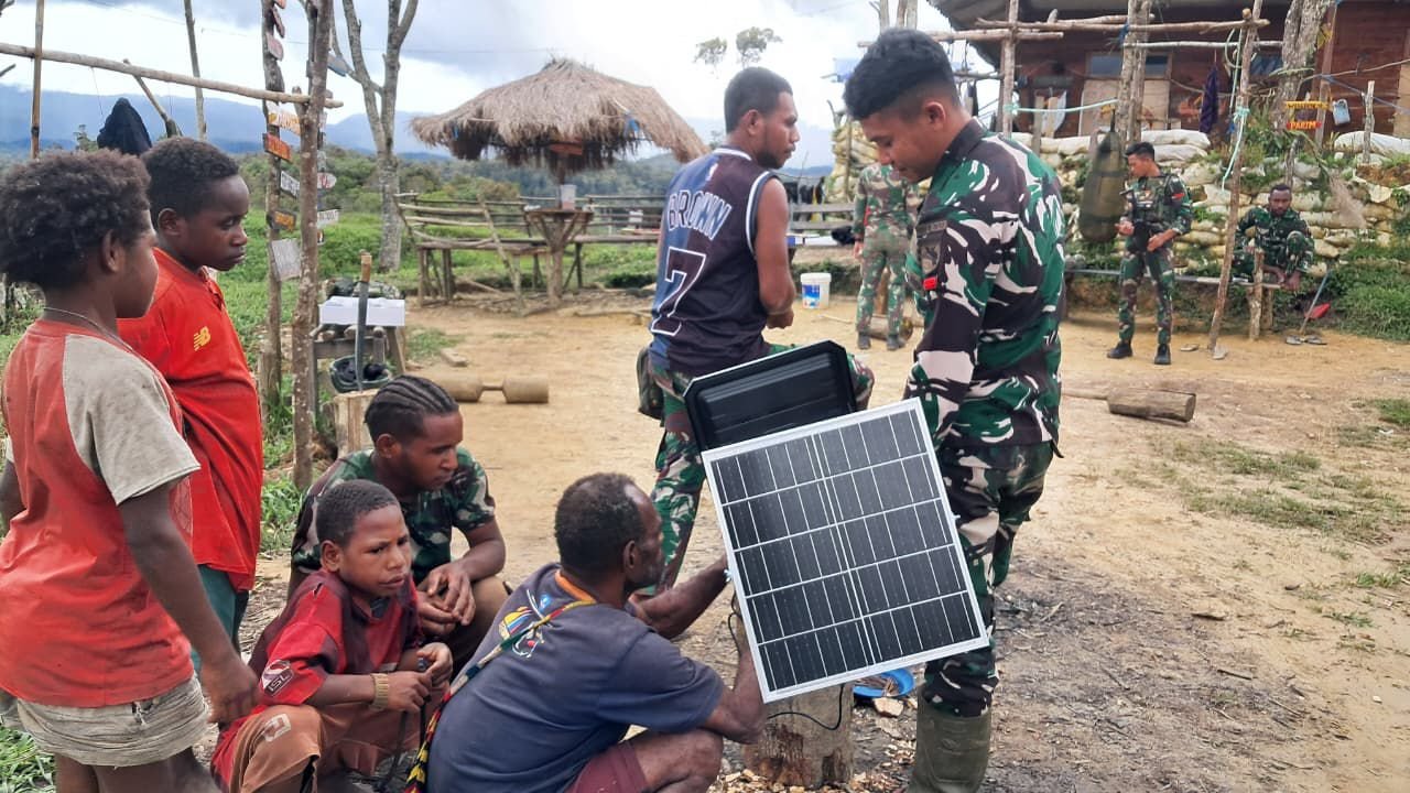 Satgas Yonif 751/VJS Pasang Lampu Penerangan untuk Kampung Kakopom