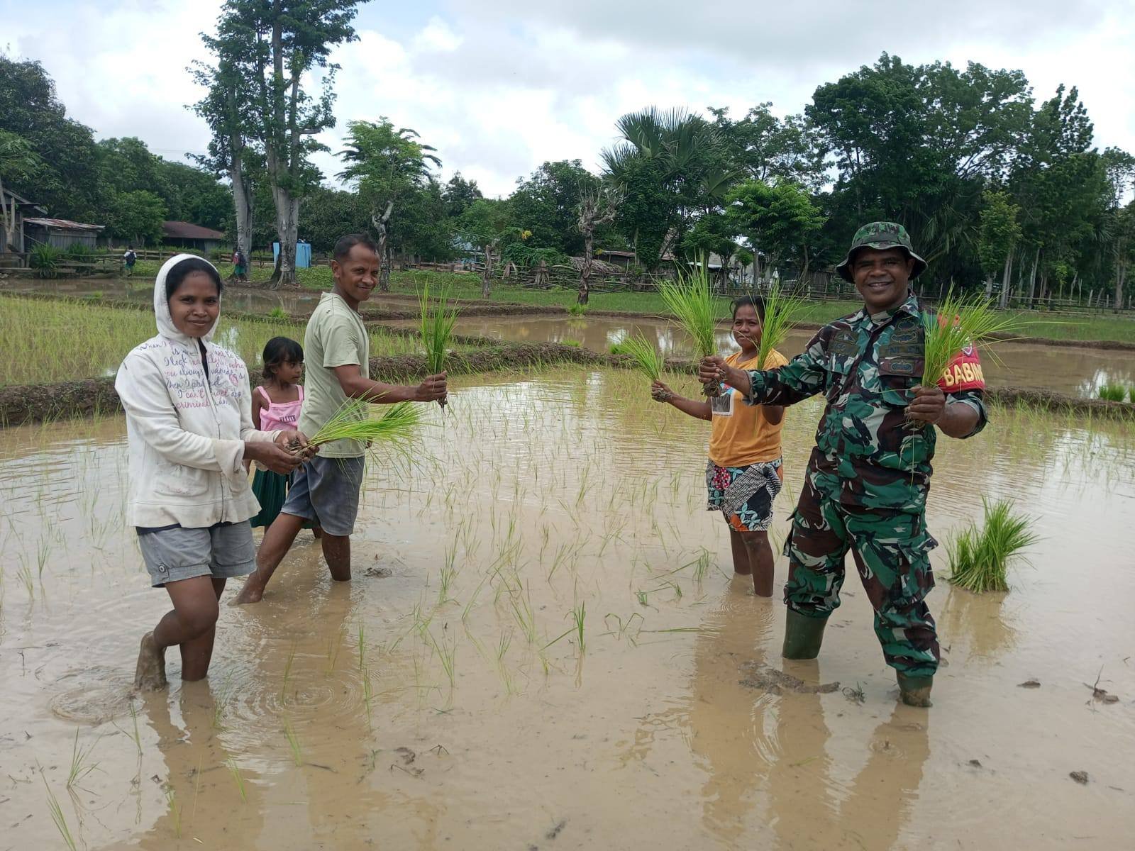 KODIM 1605/BELU, Serda Hironimus Kono Babinsa Desa Umaklaran Koramil 1605-07/Wedomu turut ke sawah membantu petani dalam menanam padi di lahan milik Bapak Vinsensius Nai Kei salah seorang petani di Dusun Weutu, Desa Umaklaran, Kecamatan Tasifeto Timur, Kabupaten Belu NTT, Senin (13/1/2025).
