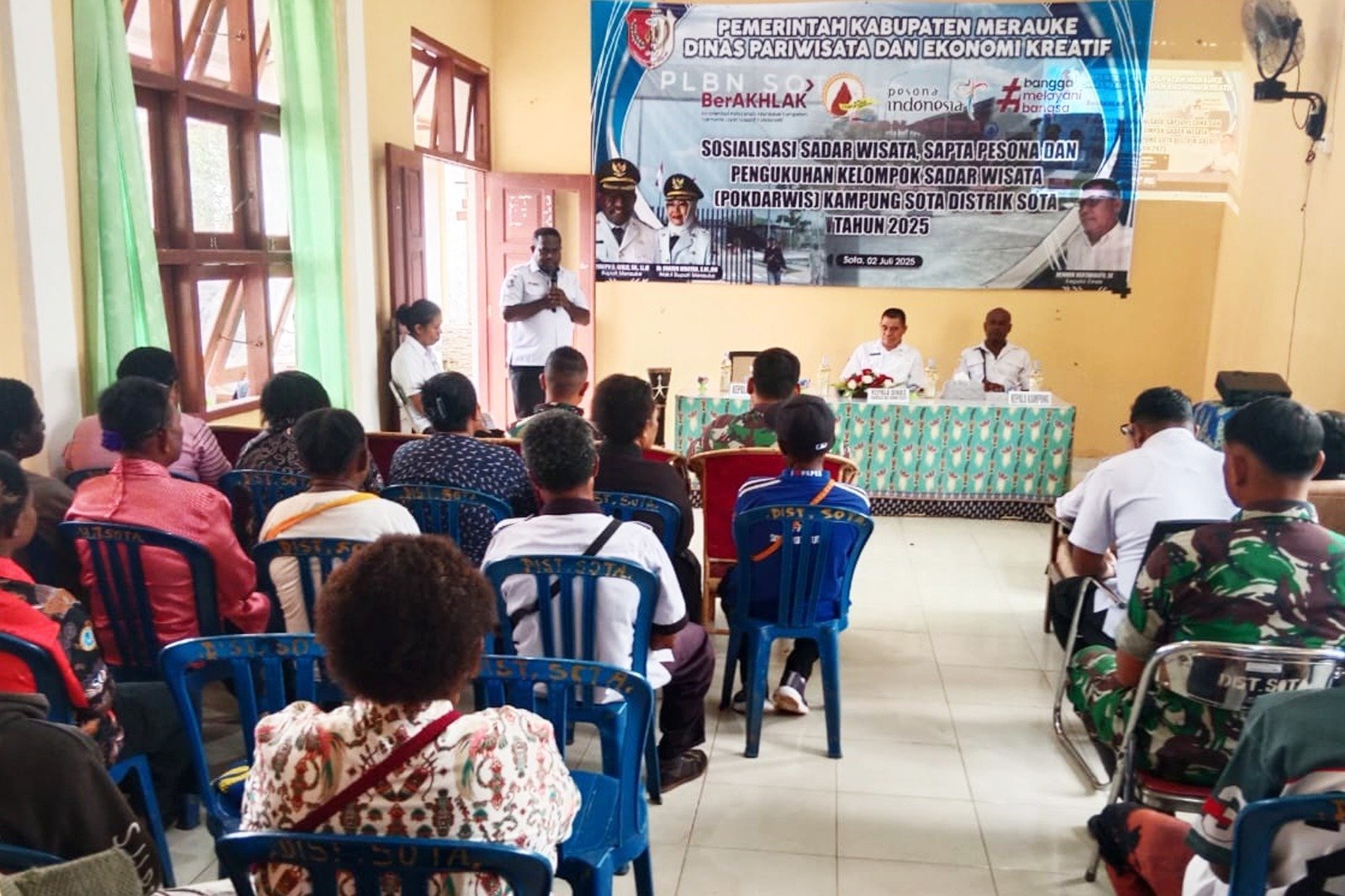 Kegiatan dilanjutkan dengan sesi sosialisasi dan pengukuhan Kelompok Sadar Wisata oleh Dinas Pariwisata kepada puluhan masyarakat dari tiga kampung tersebut. Hadir pula sejumlah tokoh dan aparat, seperti Kepala Kampung Sota Baharudin Winoto, Perwira Satgas Yonif 312/KH Lettu Inf Topan, Personel Polsek Sota Ipda Esterlina Antoneta Gebze, serta Kepala PLBN Sota Ibu Matilda Pusung.