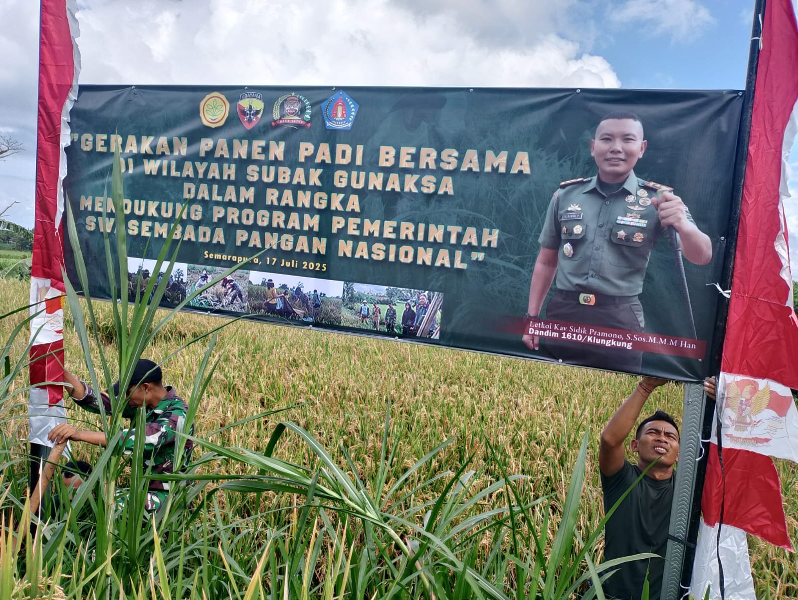 Gerakan panen padi bersama ini merupakan wujud nyata komitmen TNI, khususnya Kodim 1610/Klungkung dalam mendukung dan mensukseskan salah satu program unggulan pemerintah pusat yaitu swasembada dan Hanpangan nasional,”tegas Dandim.