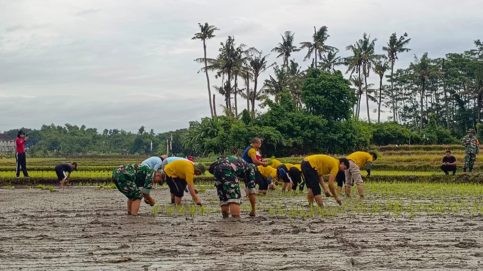 Semangat Swasembada Pangan, Koramil Banjarangkan Turun Sawah Tanam Padi Bersama