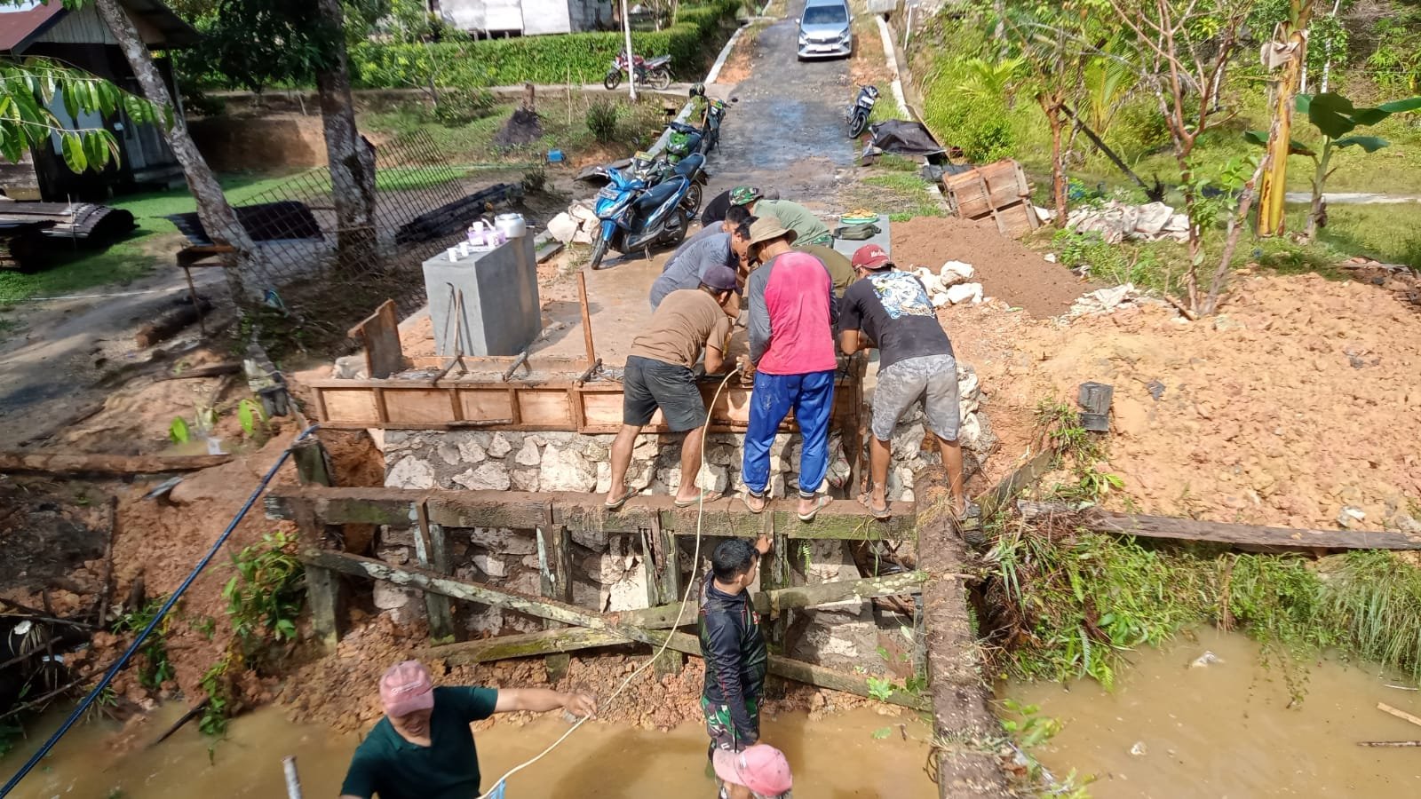 Di lapangan, tampak anggota TNI dan masyarakat bekerja sama secara efektif dalam proses pengerjaan, mulai dari pemasangan rangka hingga pengecoran dan penataan struktur jembatan. Dengan alat yang sederhana, mereka berhasil mencapai hasil yang optimal berkat kolaborasi dan rasa saling percaya satu sama lain.