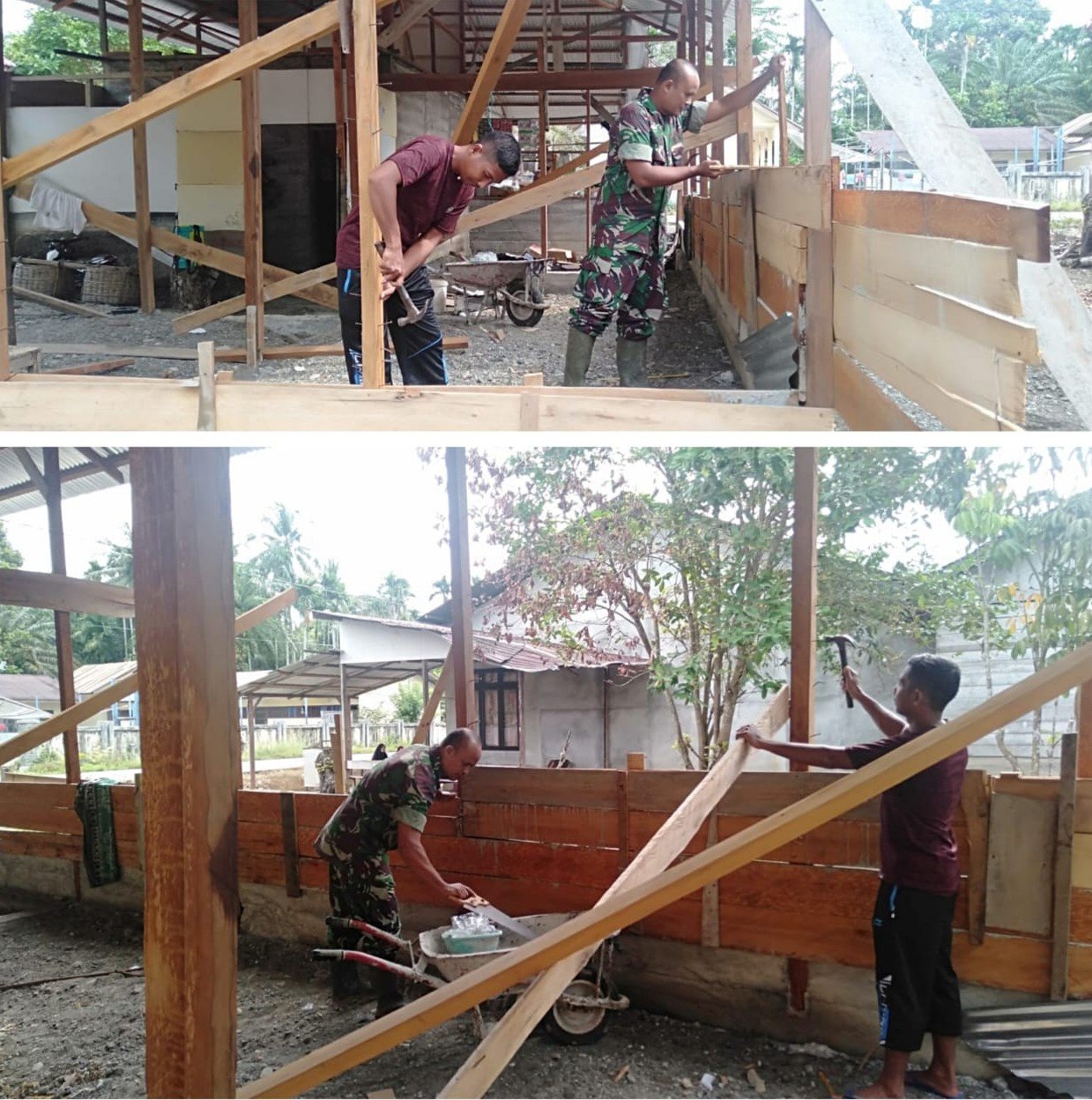 Dalam kegiatan tersebut, Sertu Robet bersama Bapak Daud terlihat kompak bergotong royong mengerjakan pembangunan rumah. Mulai dari mengangkat bahan bangunan hingga membantu proses pengerjaan, semuanya dilakukan dengan penuh semangat dan kebersamaan.