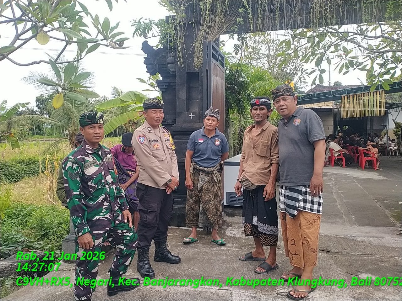 Klungkung – Dalam upaya menjaga keamanan dan ketertiban selama prosesi upacara pengabenan, Babinsa Negari Koramil 1610-02/Banjarangkan, Serka Gede Adiasa, bersinergi dengan Bhabinkamtibmas dan pecalang. Kegiatan ini berlangsung pada Rabu, 21 Januari 2026, di Dusun Sarimertha, Desa Negari, Kecamatan Banjarangkan, Kabupaten Klungkung.