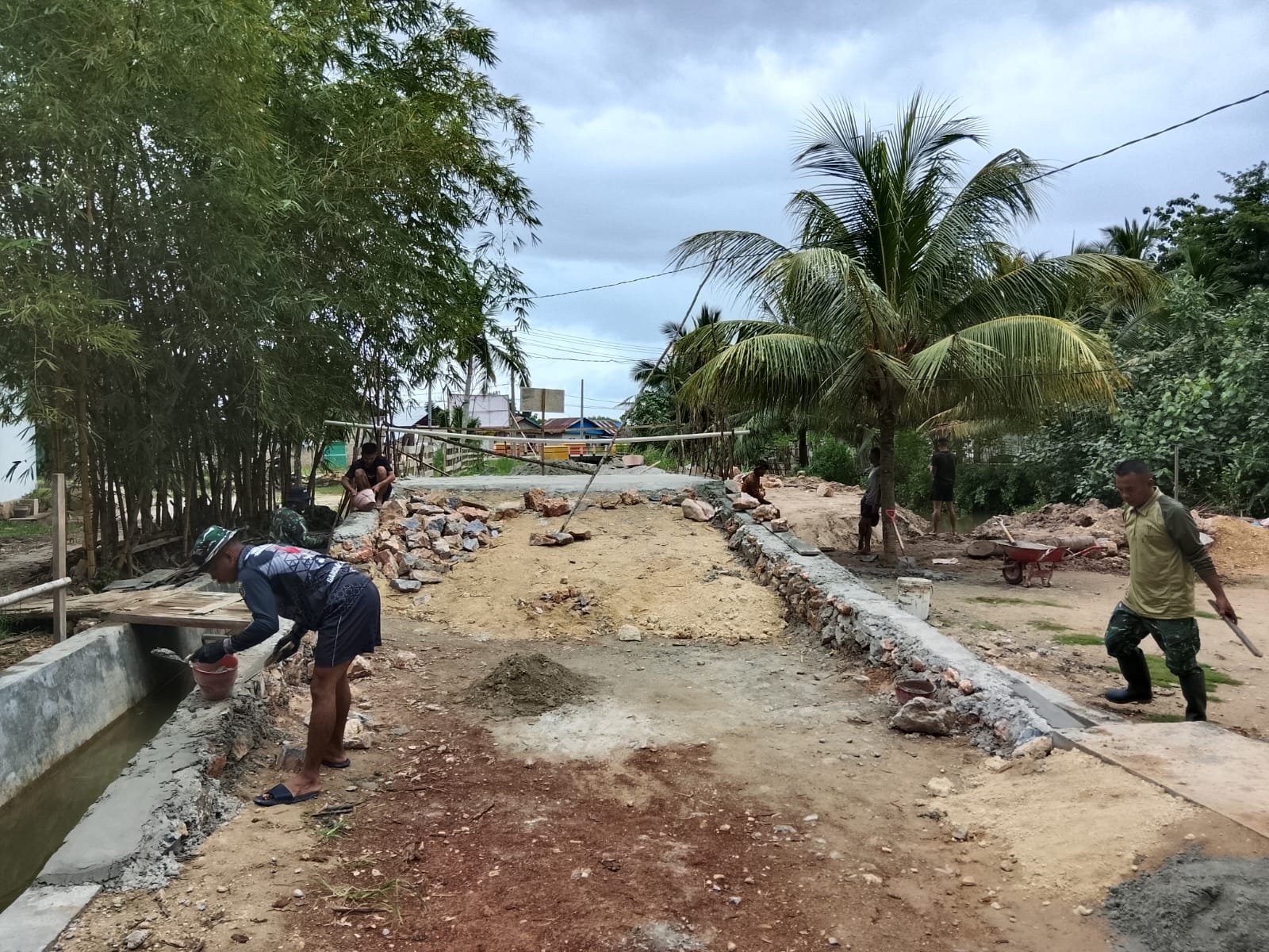 KENDARI – Kerjasama antara Satgas TMMD ke-127 dan masyarakat terlihat dalam pembangunan jembatan di Kelurahan Sambuli pada Sabtu (28/2). Program yang dilaksanakan oleh Kodim 1417/Kendari ini melibatkan pengerjaan plesteran pondasi yang dilakukan secara gotong royong, bertujuan untuk memastikan kekuatan dan kerapian struktur jembatan.