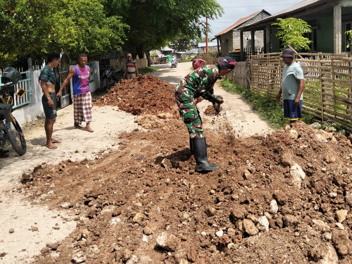 SUMBA TENGAH, NTT – Meningkatkan hubungan harmonis antara TNI dan warga, Babinsa Koramil 03/Katikutana, Sertu Ilham Lahiya, bersama masyarakat melakukan gotong royong untuk menimbun jalan yang rusak di Desa Wendewa Utara, Kecamatan Mamboro, pada Selasa, 27 Januari 2026. Kegiatan ini bertujuan untuk memperbaiki infrastruktur yang selama ini menghambat mobilitas warga, terutama saat musim hujan.