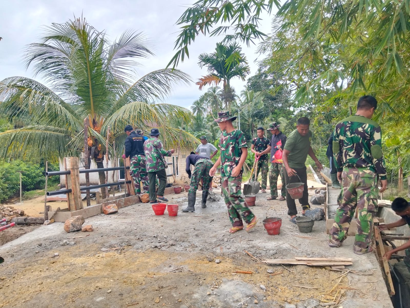 KENDARI – TNI Manunggal Membangun Desa (TMMD) ke-127 di wilayah Sambuli menunjukkan semangat kebersamaan yang tinggi. Pada Minggu (1/3), anggota Kodim 1417/Kendari bersama dengan masyarakat setempat bekerja sama dalam pengecoran pagar pengaman jembatan.
