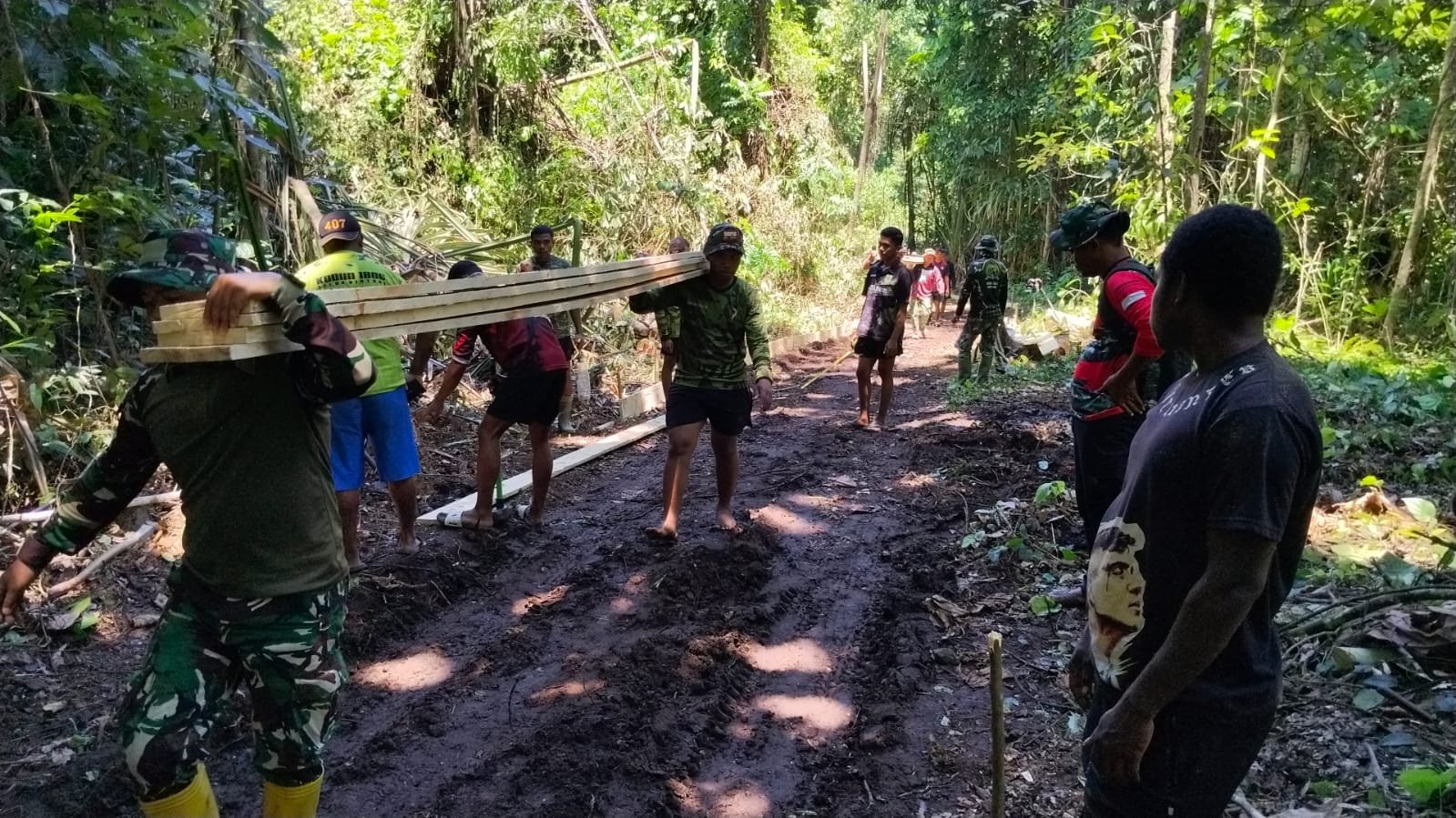 Anggota Satgas bersama masyarakat melakukan kerja sama pembuatan mal atau cetakan untuk pengecoran jalan. Aktivitas ini berlangsung dengan harmonis, di mana setiap orang aktif berkontribusi demi mempercepat proses kerja.