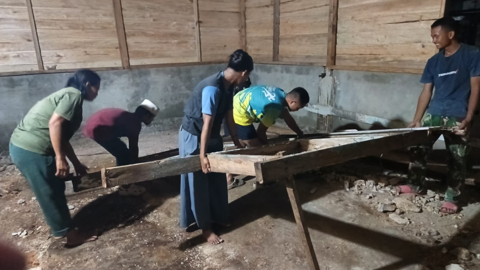 Dengan bantuan penerangan sederhana, para warga dan prajurit TNI bekerja sama untuk menyelesaikan berbagai tahap konstruksi, mulai dari penyusunan bata hingga pemasangan material bangunan lainnya.