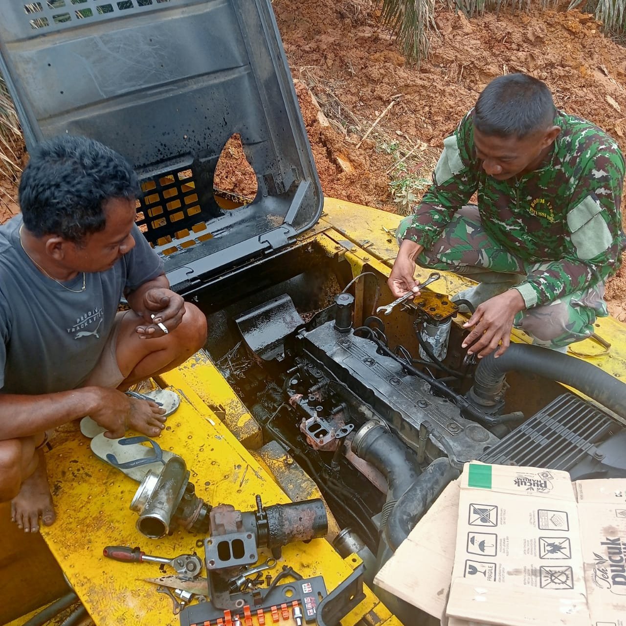 Lamandau – Panas terik dan medan berat tidak menyurutkan semangat anggota Satgas TMMD Reguler ke-125 Kodim 1017/Lamandau. Saat alat berat mengalami kerusakan di tengah pengerjaan, personel langsung bergotong royong memperbaiki, Sabtu(09/08/25).