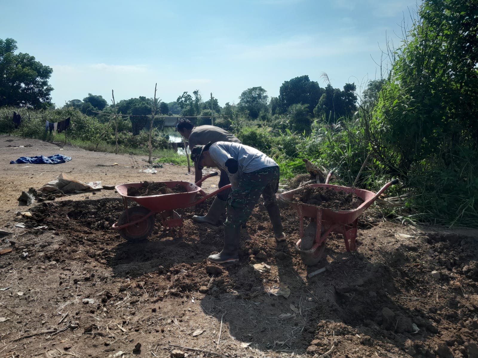 Tanah Timbunan Manual untuk Pos Kamling, TNI-Warga Kompak Bergotong Royong