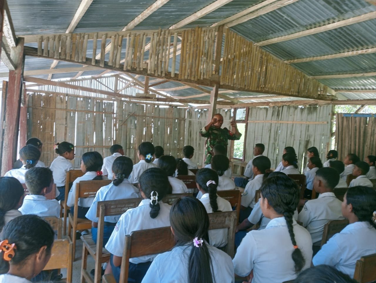 TTS _ Serka Okri Bano Babinsa Koramil 1621-02/Abanteng berikan materi Wasbang dan Bela Negara di Masa Pengenalan Lingkungan Sekolah (MPLS) bagi siswa – siswi baru di SMA Negeri Banat Kab.Timor Tengah Selatan. Rabu Pagi (16/07/2025).