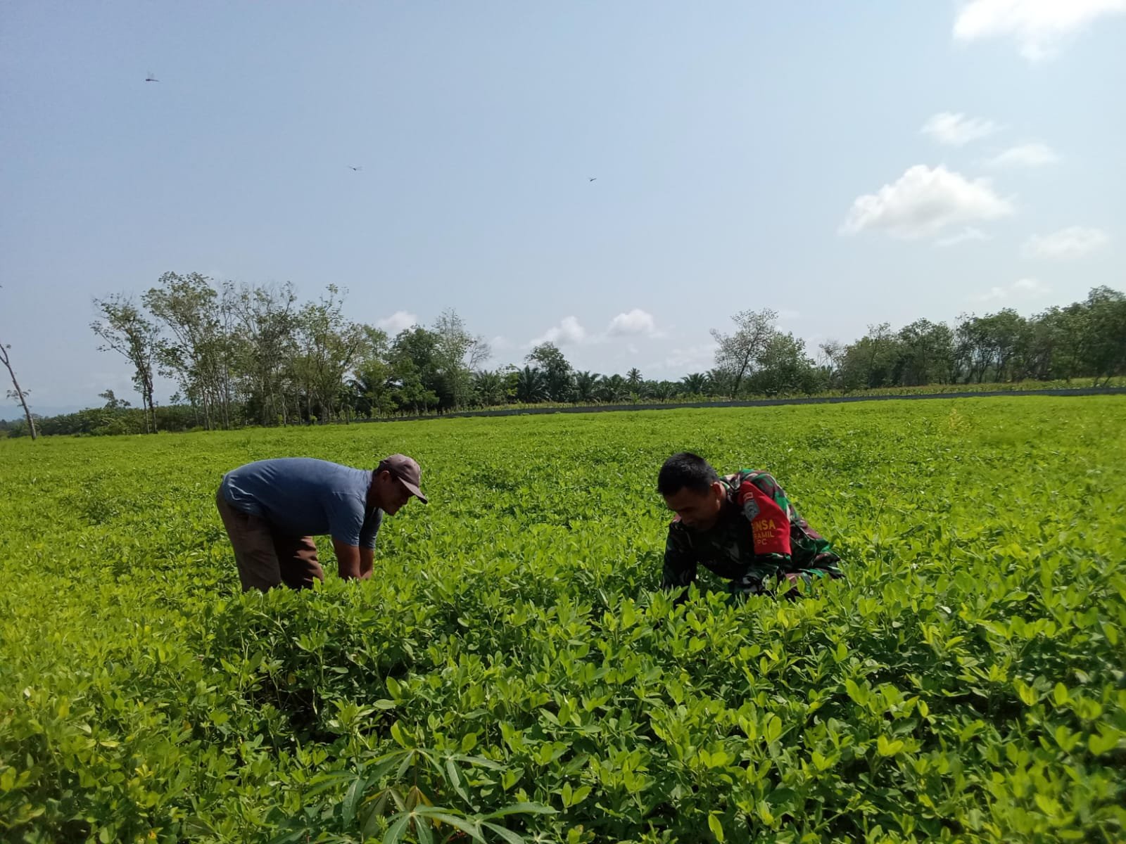 Pada kesempatan tersebut, Babinsa Sertu Modini turun langsung ke lahan pertanian untuk memantau perkembangan tanaman kacang tanah milik warga. Selain melakukan pengecekan kondisi tanaman, ia juga memberikan bimbingan dan motivasi kepada para petani agar tetap semangat dalam mengelola lahan pertanian mereka.