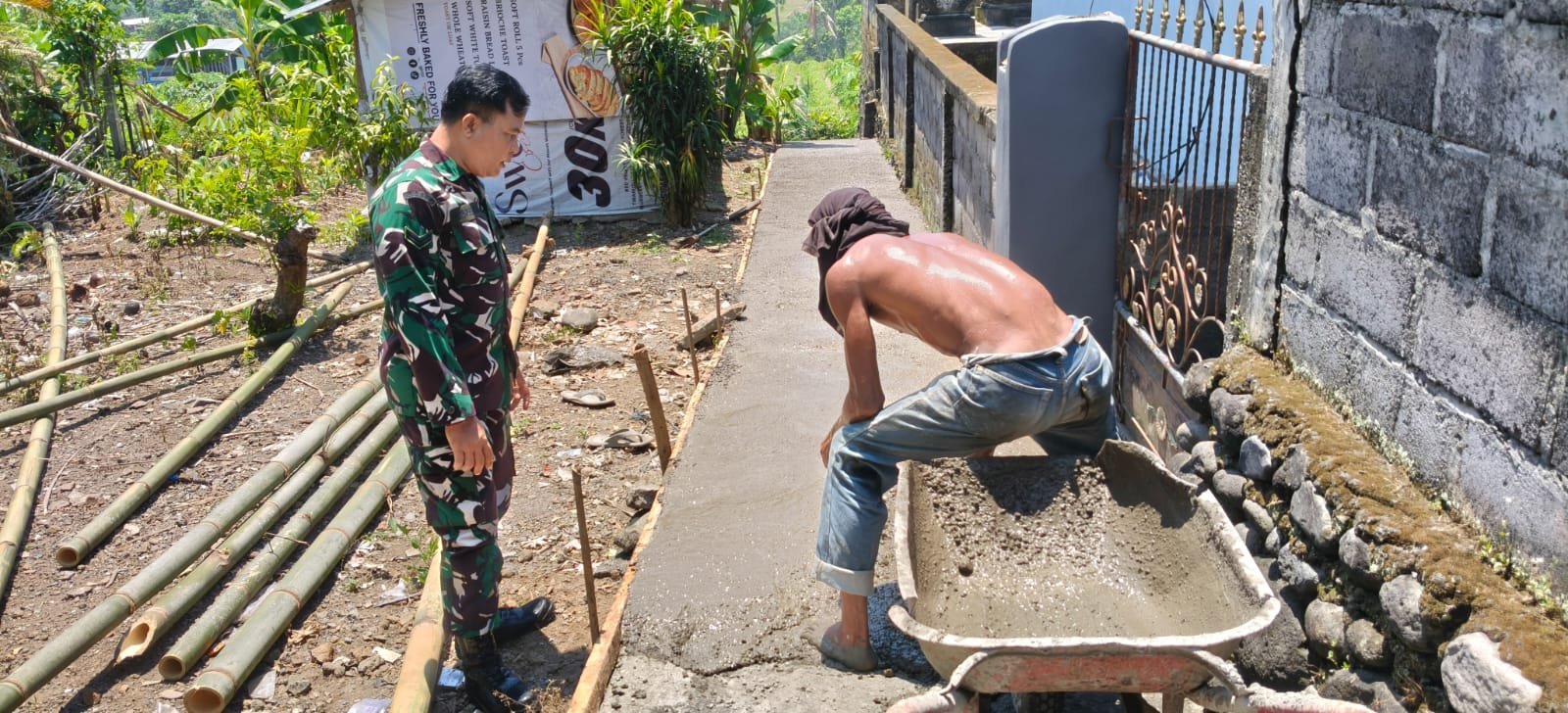 Klungkung, Dalam rangka memastikan pembangunan di wilayah binaan berjalan aman dan lancar, Babinsa Tihingan Sertu Putu Agustana bersama KBD Dusun Mengguna, Desa Tusan, Kecamatan Banjarangkan, Kabupaten Klungkung melaksanakan peninjauan perbaikan gang, Kamis ( 16/10/25 ).