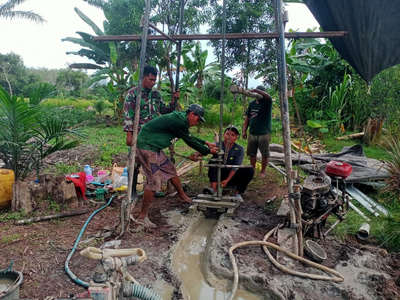 Tampak di lapangan, anggota Satgas TMMD bekerja sama dengan masyarakat setempat melakukan proses pengeboran sumur. Dengan peralatan sederhana dan semangat gotong royong, mereka bahu membahu menggali tanah demi menemukan sumber air yang nantinya akan dimanfaatkan seluruh warga desa.