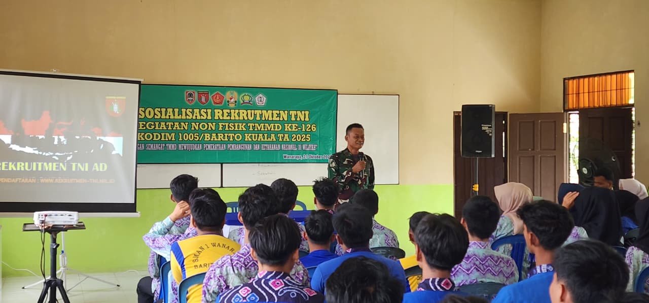 BARITO KUALA – Program TNI Manunggal Membangun Desa (TMMD) ke-126 Kodim 1005/Barito Kuala kembali menghadirkan kegiatan nonfisik yang menyentuh generasi muda. Kali ini, Satgas TMMD melaksanakan sosialisasi rekrutmen prajurit TNI Angkatan Darat di Aula SMA Negeri 1 Wanaraya, Kecamatan Wanaraya, Rabu (23/10).