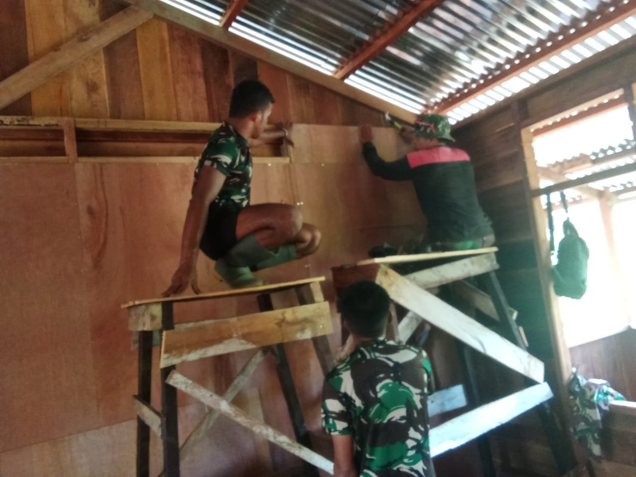 Nabire, 1 Agustus 2025 — Program rehabilitasi Rumah Tidak Layak Huni (RTLH) di Kampung Manunggal Jaya, Distrik Makimi, terus menunjukkan progres menggembirakan. Kegiatan yang menjadi bagian dari Program TMMD ke-125 Kodim 1705/Nabire tersebut kini telah memasuki tahap pemasangan dinding bagian dalam rumah menggunakan material tripleks.