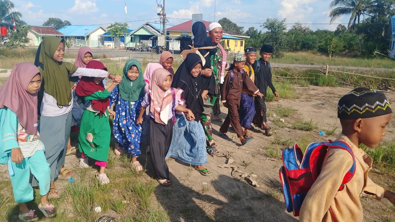 Usai menuntaskan pekerjaan fisik di lapangan, Sabtu (18/10) sore, Serka Suherman memilih menghabiskan sore harinya bersama anak-anak di mushola desa. Dengan masih mengenakan seragam lorengnya yang penuh kebanggaan, ia duduk di atas tikar sederhana, mengajari mereka membaca Al-Qur’an dan memahami nilai-nilai kebaikan.