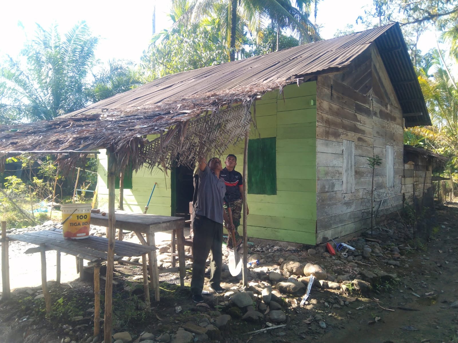 Di tengah suara palu yang bersahutan, anggota Satgas TMMD bersama masyarakat bekerja seperti satu keluarga. Papan dinding lama diganti, bagian rumah diperkuat, sementara teras yang dulunya beratap daun akan diganti dengan material yang lebih kokoh.