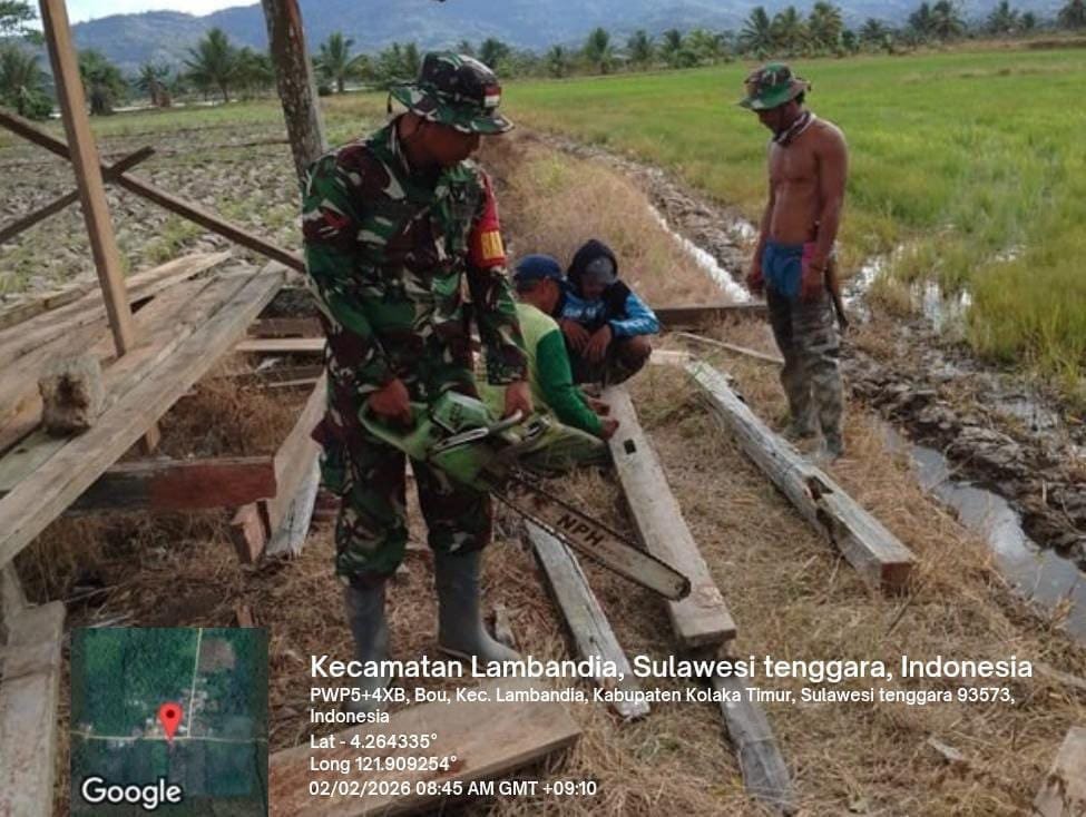Kolaka Timur, Senin (2/2/2026) – Dalam upaya mendukung ketahanan pangan dan memperkuat hubungan dengan masyarakat, Kopda Haslan, Babinsa dari Koramil 1412-01/Tirawuta, terlibat langsung dalam kegiatan kerja bakti untuk membantu pembangunan rumah tani. Kegiatan ini berlangsung di Dusun 3, Desa Bou, Kecamatan Lambandia, Kabupaten Kolaka Timur.