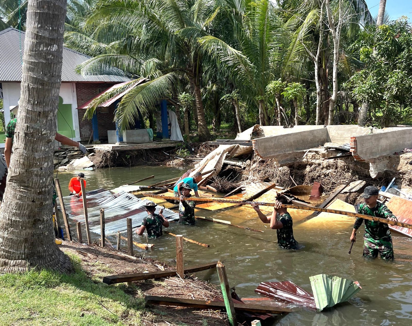Dalam suasana yang penuh semangat gotong royong, prajurit TNI berkolaborasi dengan warga setempat untuk membersihkan sisa-sisa genangan air, puing-puing bangunan, dan material seperti lembaran seng serta batang pohon kelapa yang berserakan di sekitar area balai pengajian. Babinsa Desa Bluka Teubai, Serka Joko Susilo, menjelaskan bahwa aksi ini merupakan bagian dari upaya pemulihan berkelanjutan pasca bencana. “Tujuan kami adalah agar balai pengajian ini cepat bersih dan dapat difungsikan kembali oleh masyarakat,” ungkapnya.