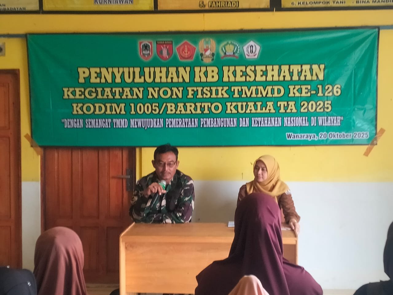 BARITO KUALA – Kepedulian TNI terhadap kesehatan masyarakat kembali diwujudkan melalui kegiatan penyuluhan Keluarga Berencana (KB) dan kesehatan dalam program TNI Manunggal Membangun Desa (TMMD) Ke-126 Kodim 1005/Barito Kuala, yang digelar di Desa Tumih, Kecamatan Wanaraya.