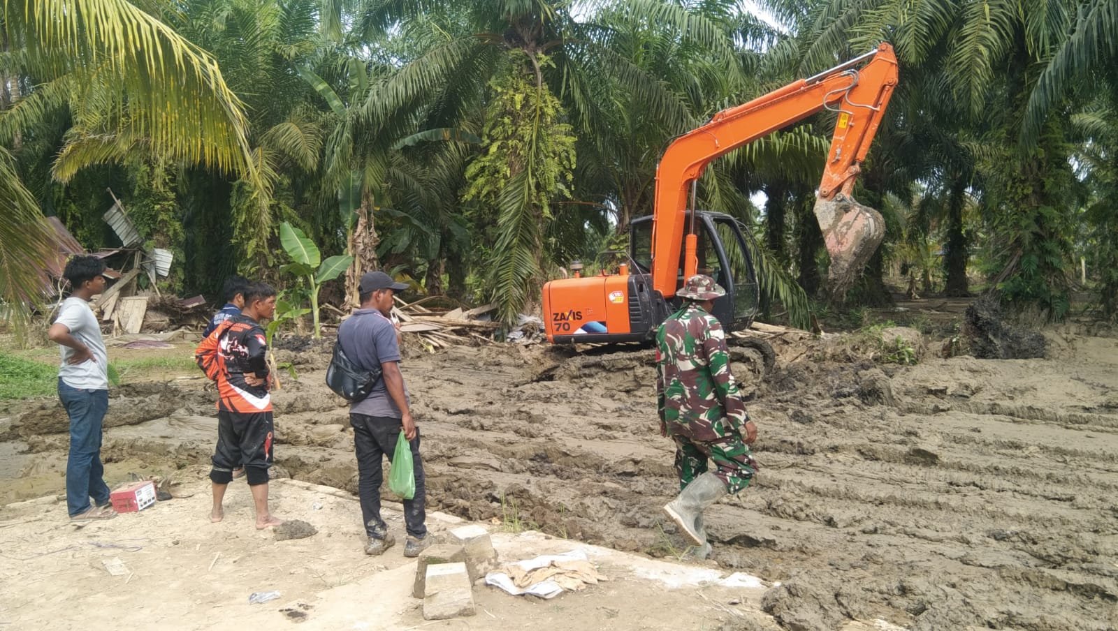 Untuk mendukung kelancaran kerja, satu unit ekskavator Hitachi Zaxis 70 dikerahkan ke lokasi. Sertu Hayuti berkolaborasi dengan perangkat desa untuk mengarahkan operasional alat berat tersebut agar pembersihan lahan dapat dilakukan secara efektif dan sesuai dengan rencana teknis.
