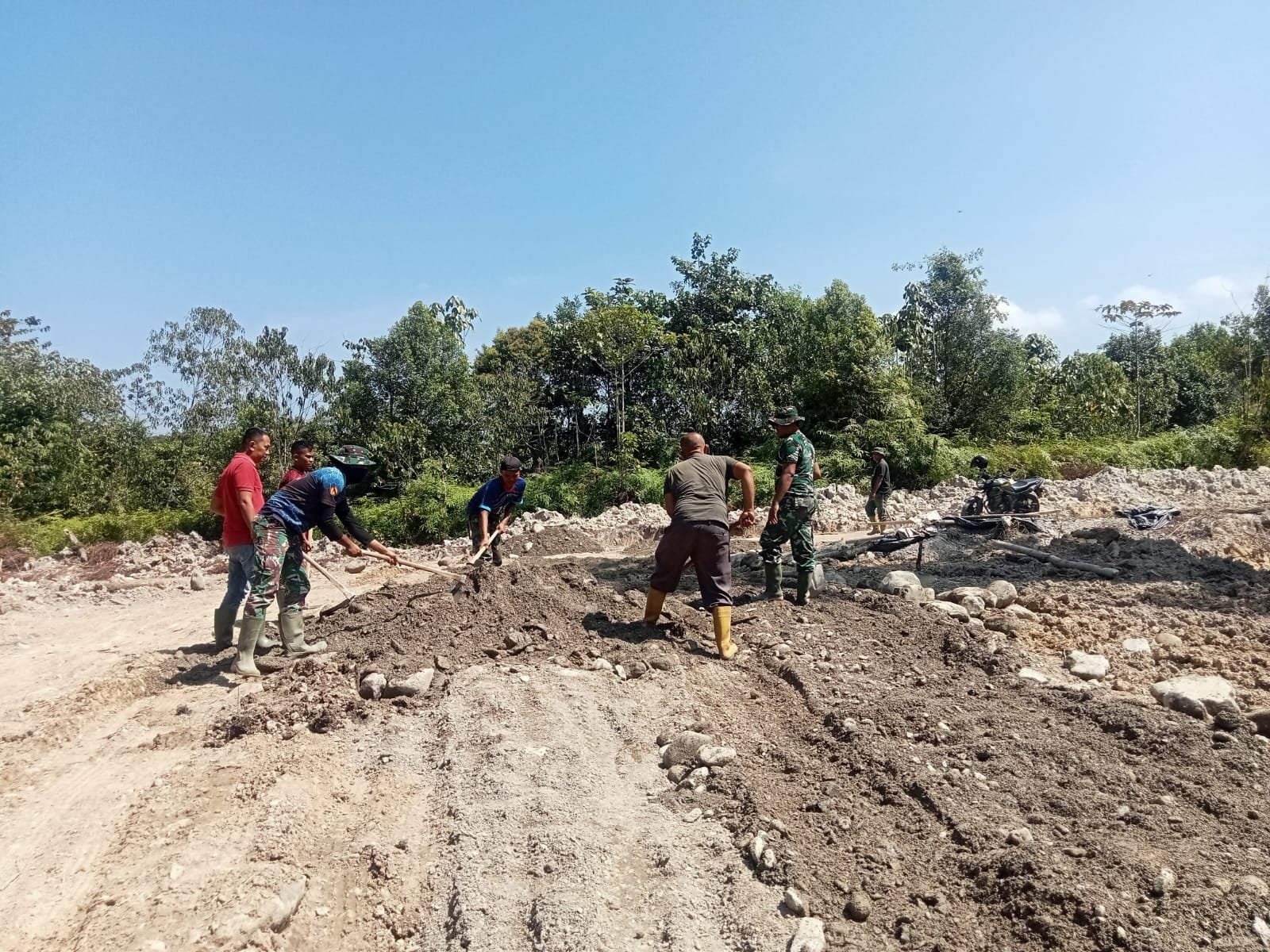Berdasarkan pantauan di lapangan, Senin (9/3/2026), alat berat excavator bekerja meratakan timbunan tanah sebagai dasar badan jalan. Pada beberapa titik, anggota Satgas TMMD bersama masyarakat melanjutkan pekerjaan secara manual menggunakan cangkul dan sekop.