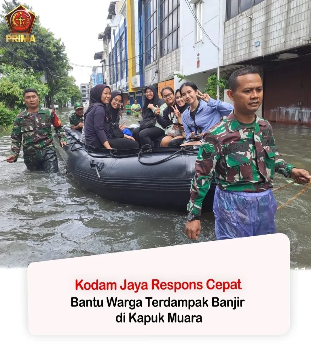 Pada Jumat, 23 Januari 2026, personel TNI dari Kodam Jaya/Jayakarta, termasuk Kodim 0502/Jakarta Utara serta Yonif TP 843 PYV dan Yonif TP 899/BSG, menunjukkan kepedulian mereka terhadap warga yang terkena banjir di Kelurahan Kapuk Muara, Kecamatan Penjaringan, Jakarta Utara. Banjir yang melanda kawasan tersebut disebabkan oleh curah hujan yang tinggi selama beberapa hari terakhir, mengakibatkan meluapnya kali dan merendam pemukiman warga.